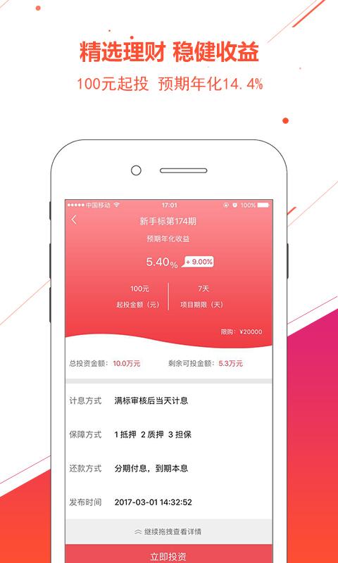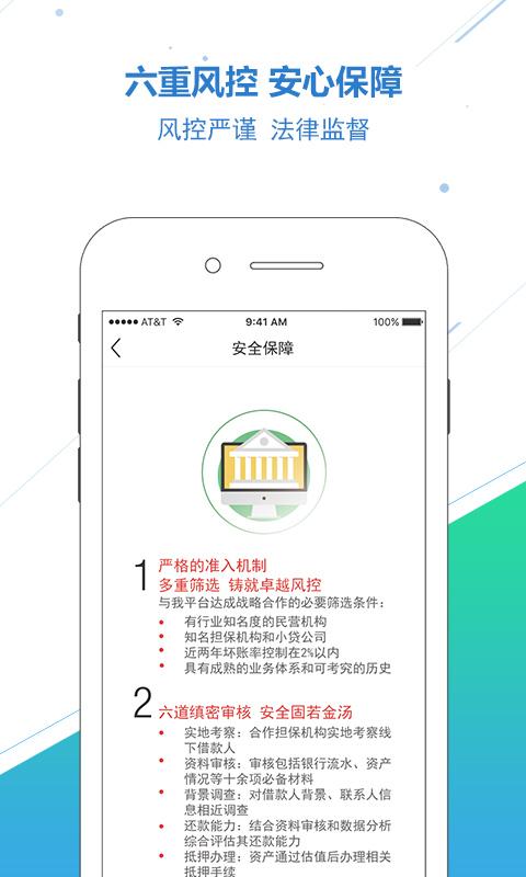 全面的安全保障:采用严格的准入机制、风控审信保障、还款来源保障、全程法律监督和技术安全保障,确保用户的投资安全。1.