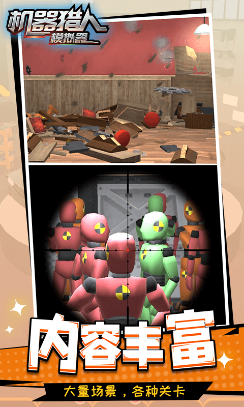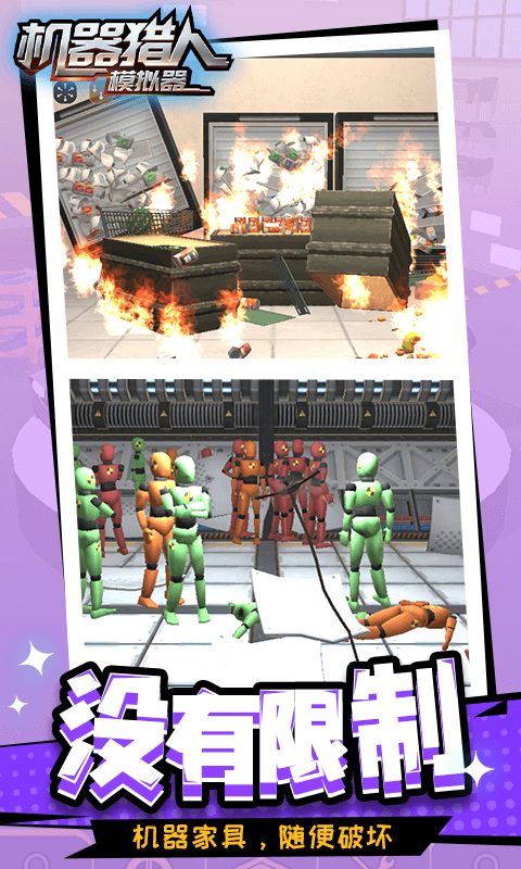 机器猎人模拟器内置菜单是一款集冒险、解压于一体的3d物理效果打造的休闲益智手游。在这款游戏中,玩家将扮演一名机器猎人,身处多样化的模拟环境中,利用丰富的武器库摧毁各种模型物品,尤其是机器人,以此来释放压力并享受破坏带来的快感。游戏画面精致,物理效果逼真,提供了高度的自由度和多种挑战模式,让玩家在尽情破坏的同时,也能体验到冒险和解谜的乐趣。