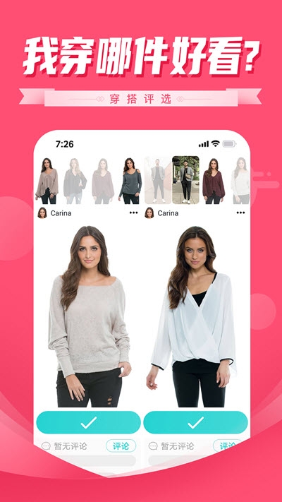2. 在线评选:用户可以参与他人的穿搭评选,也可以发起自己的穿搭对比,邀请他人进行投票。