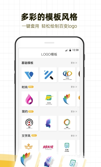 多彩模板风格:提供基础模板及时尚、简约、文字风等多种风格模板,轻松绘制百变logo。3.