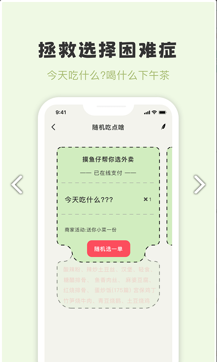 3. 随机选择功能,解决选择困难症用户的午餐和奶茶选择问题。