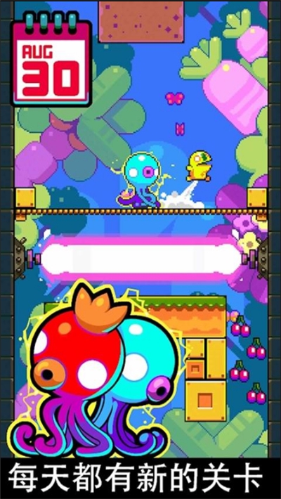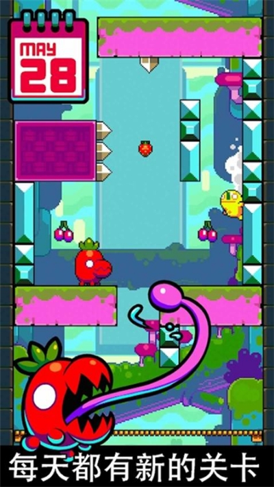闰日(leap day)是一款由nitrome公司开发的休闲益智类跑酷闯关游戏,于2016年5月11日在google play和app store同步发布。这款游戏以其独特的“每天一个新关卡”的设计理念和经典的像素风格,迅速吸引了大量玩家的关注。在闰日中,玩家需要控制角色不断跳跃前进,穿越由多层平台构成的高塔,收集沿途的水果并躲避敌人的攻击,最终到达塔顶的金奖杯处通关。游戏的操作非常简单,只需点击屏幕即可使角色跳跃,但越简单的操作往往意味着越高的挑战性,密集的陷阱和敌人让每一次跳跃都充满了紧张感。