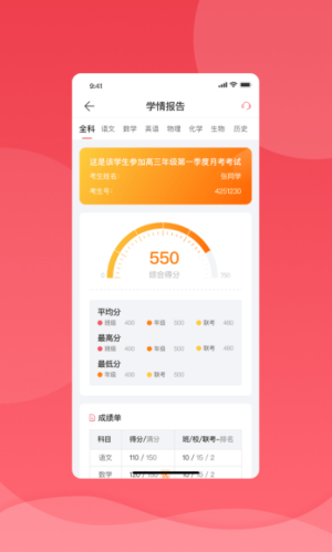 2. 成绩查询:在app首页或学情报告页面,家长可以查看孩子的考试成绩和学情分析报告。