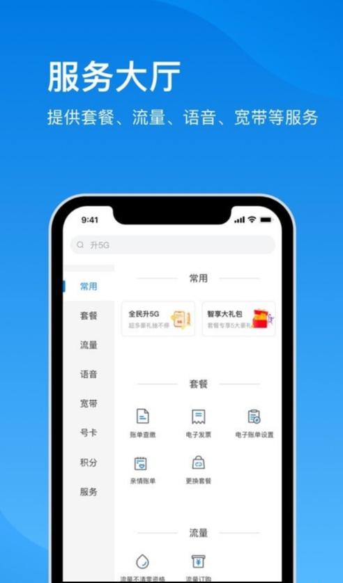 4. 业务办理:支持套餐查询、充值缴费等功能,用户可以随时随地办理各种电信业务。