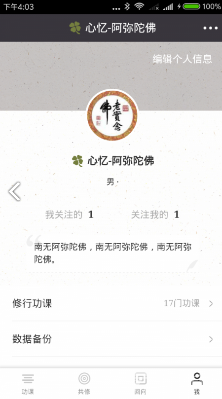 3. 功能丰富:除了基本的念佛持咒计数和功课记录功能外,还支持云端备份、同修排名、群共修统计等多项实用功能。