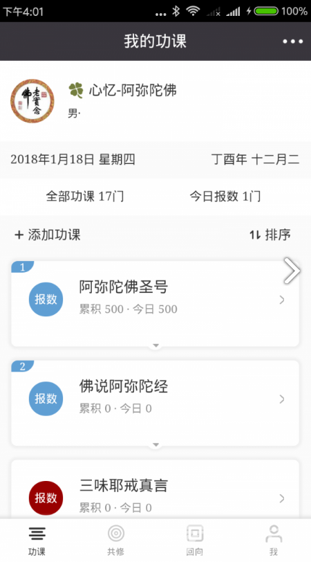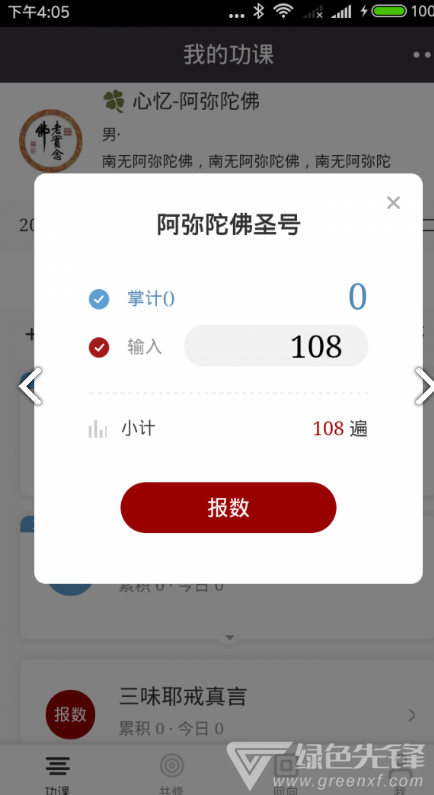 3. 功能使用:用户可根据需求选择使用念佛持咒计数、功课记录、修行统计等功能,并可随时查看和管理自己的修行数据。