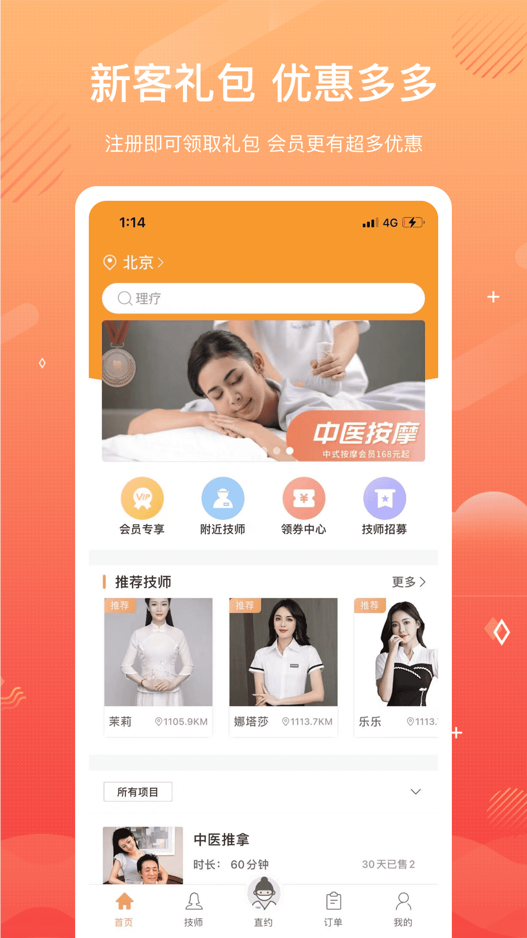 3. 浏览技师信息,包括距离、经验、接单数量、用户评价等,选择心仪的技师和服务项目。
