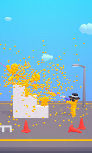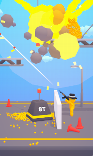 2. 射击战斗:玩家需要利用手中的火箭筒,精准射击赛道上的黄色男人,将其击溃。