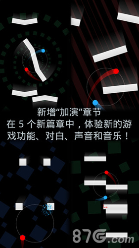 1. 抽象艺术风格:游戏采用极简的抽象艺术风格,黑色背景、白色障碍物、红蓝双色小球,营造出神秘而精致的游戏氛围。