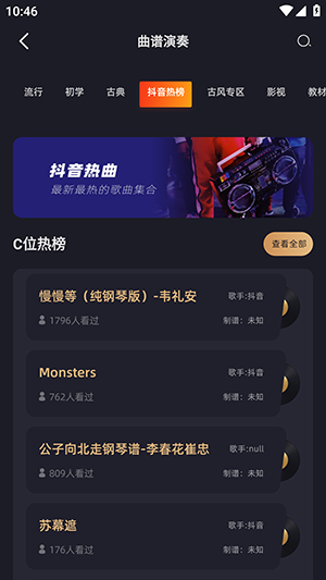 在主界面上,用户可以通过搜索功能输入关键词或曲目名称来查找乐谱,也可以通过分类浏览不同的乐谱资源。3.
