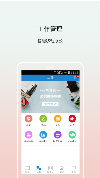 1. 全方位企业管理:牛管家提供了完善的企业内部管理模块,涵盖考勤签到、工作审批、员工日志、公司公告、视频会议等多样化功能,为企业构建了一个高效的移动办公管理平台。