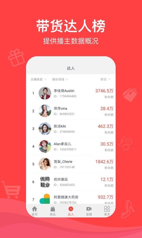3. 提供详细的数据分析功能,用户可以查看直播和达人的详情数据,了解带货趋势和潮流。