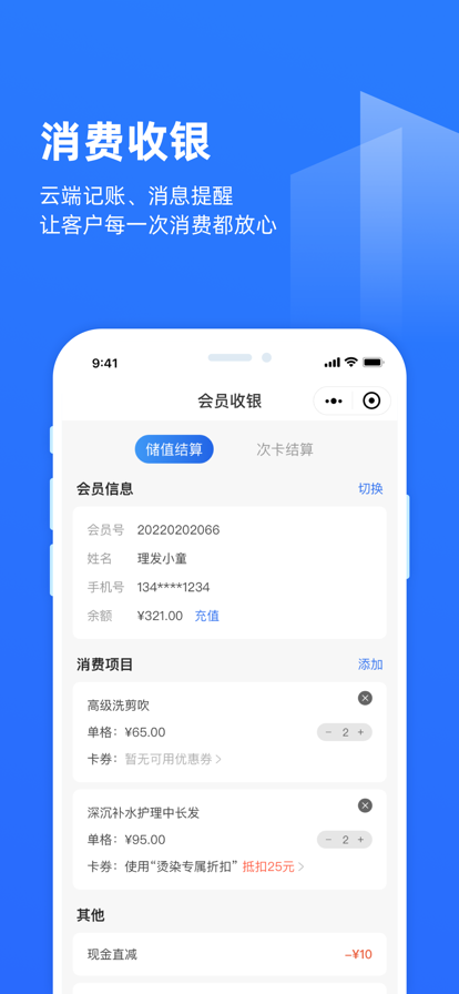 理发通是一款由厦门微秒世界科技有限公司专为美发行业定制开发的会员收银管理系统。这款软件支持安卓、ios等多平台使用,商家可以通过理发通app、理发通网站以及微信小程序进行店铺会员管理,实现会员收银、散客收银,同时提供会员办卡充值、建立会员档案、消费提醒、会员积分等多种功能。自2021年2月1日上线以来,理发通不断更新优化,已成为众多美发店信赖的管理工具。