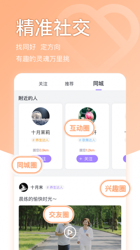3. 社交服务:通过同城圈、兴趣圈等社交功能,让用户能够足不出户交到志同道合的朋友,交流文化,传递健康正能量。