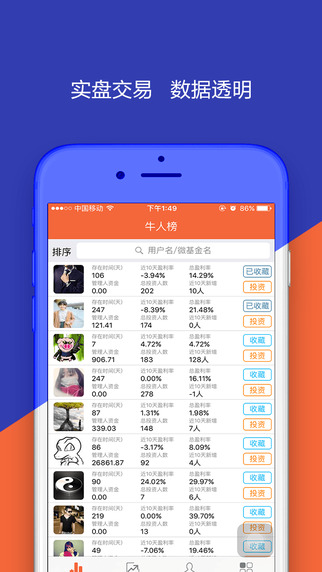 在app首页或牛人榜中,用户可以浏览并筛选自己感兴趣的微基金,查看操盘牛人的操盘数据和历史业绩。4.