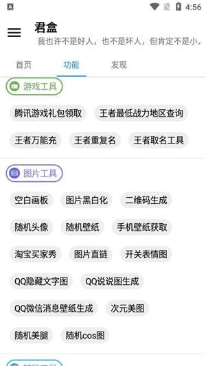 君盒是一款专为android平台设计的多功能工具箱软件,以其丰富的实用工具和便捷的操作体验赢得了广大用户的喜爱。这款软件集合了日常工具、qq工具、游戏工具、图片工具等多种功能于一体,旨在为用户提供一站式的服务体验。君盒不仅功能全面,而且体积小巧,不占用过多手机内存,同时其界面设计简洁明了,操作流畅,让用户能够轻松上手。