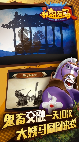 我朝有马是一款由网易开发的安卓平台三国题材动作卡牌类手机游戏。该游戏采用3d建模技术,为玩家呈现极致高清画面,将严肃的三国历史幻化成搞怪模样,通过诙谐的剧情和恶搞q萌的游戏画风,带给玩家全新的游戏体验。