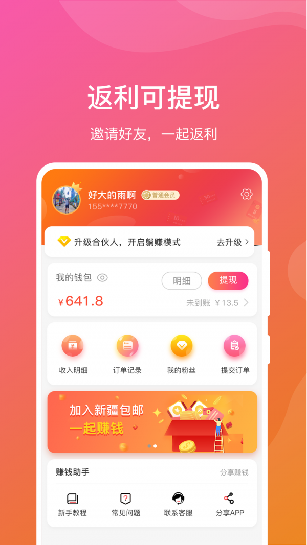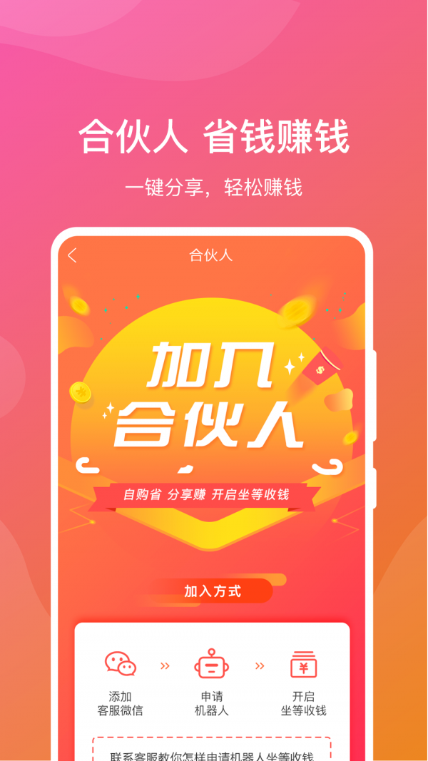 2. 合伙赚钱:用户可加入合伙人计划,通过分享商品赚钱,实现购物与赚钱两不误。