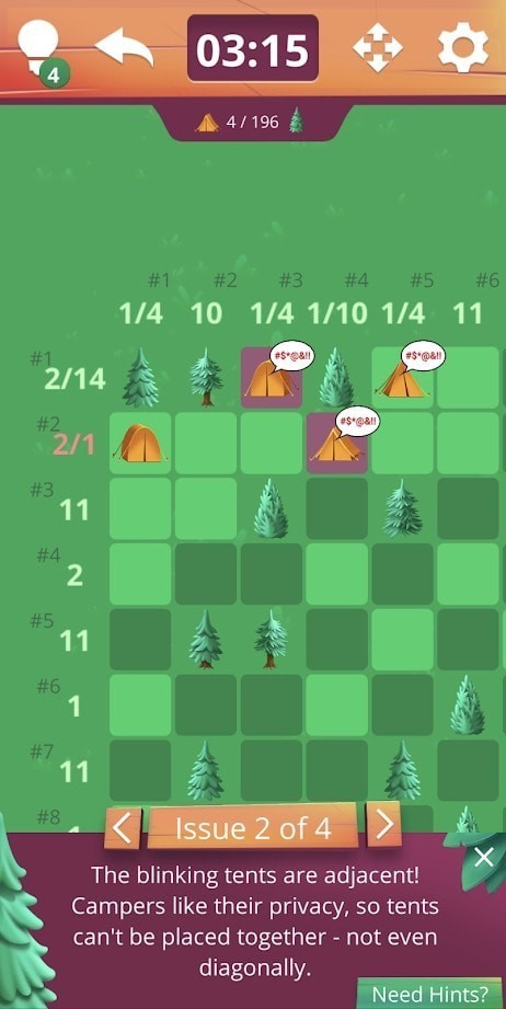 2. 避免相邻:帐篷不能临边相邻也不能对角相邻,玩家需要合理安排帐篷的位置,避免相互冲突。