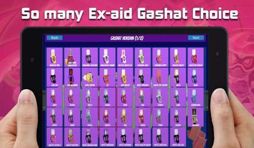 1. 卡带变身系统:游戏内置64种Gashat卡带,覆盖原作TV版及剧场版形态。玩家点击屏幕右侧“HENSHIN”按钮打开卡带库,选择任意卡带插入虚拟腰带,通过双击腰带触发变身动画,伴随“Level Up!”等经典台词及形态切换音效。