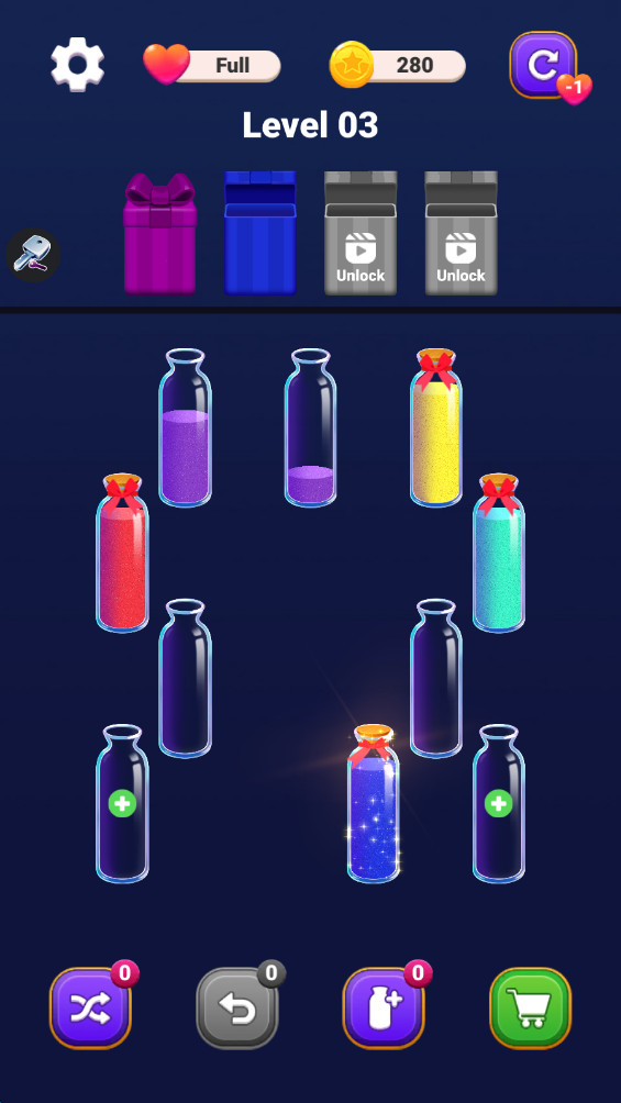 2. 策略性操作:高阶关卡中,玩家需利用空试管作为中转站,或逆向思考优先处理底层沙粒,避免因操作失误导致全局崩溃。