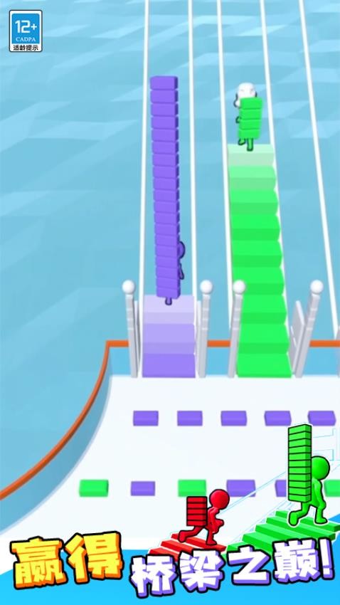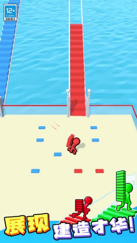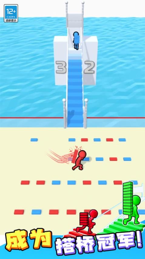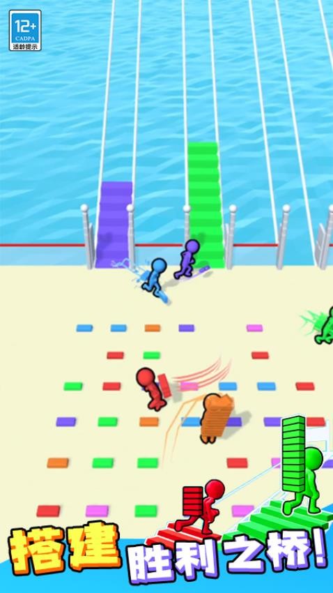 2. 玩法深度丰富:游戏融合颜色匹配、路线规划、干扰策略三大核心机制。玩家需精准计算砖块数量与桥梁结构稳定性,同时利用“撞击夺砖”“覆盖楼梯”等创新玩法,在竞争中制造变数,提升对局趣味性。