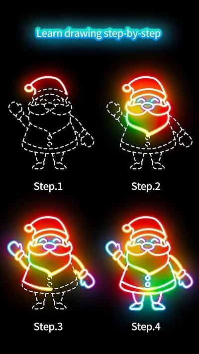 1. 独创发光特效:圣诞老人全身散发柔和光芒,绘图工具支持荧光色系,画作在暗光环境下呈现璀璨效果,突破传统绘画游戏的视觉体验。