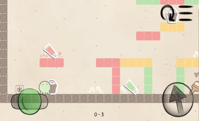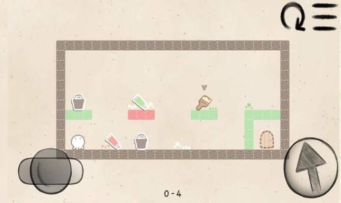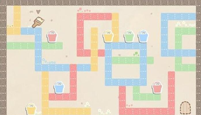1. 色彩解谜机制:小章鱼仅能穿越同色区域,玩家需触碰场景中的颜料桶切换颜色,或利用刷子道具绘制虚线标注的机关门,突破结构各异的障碍。