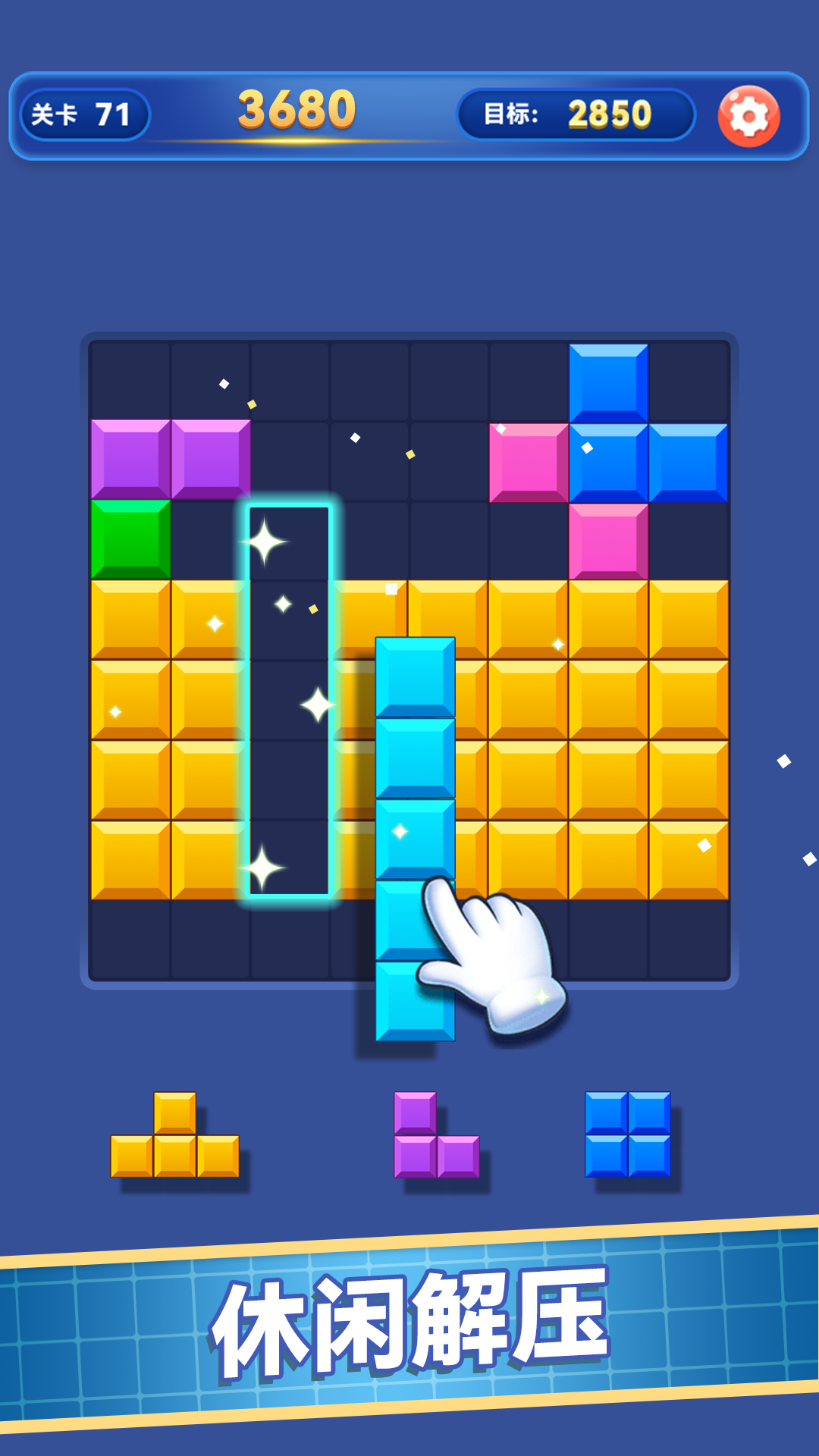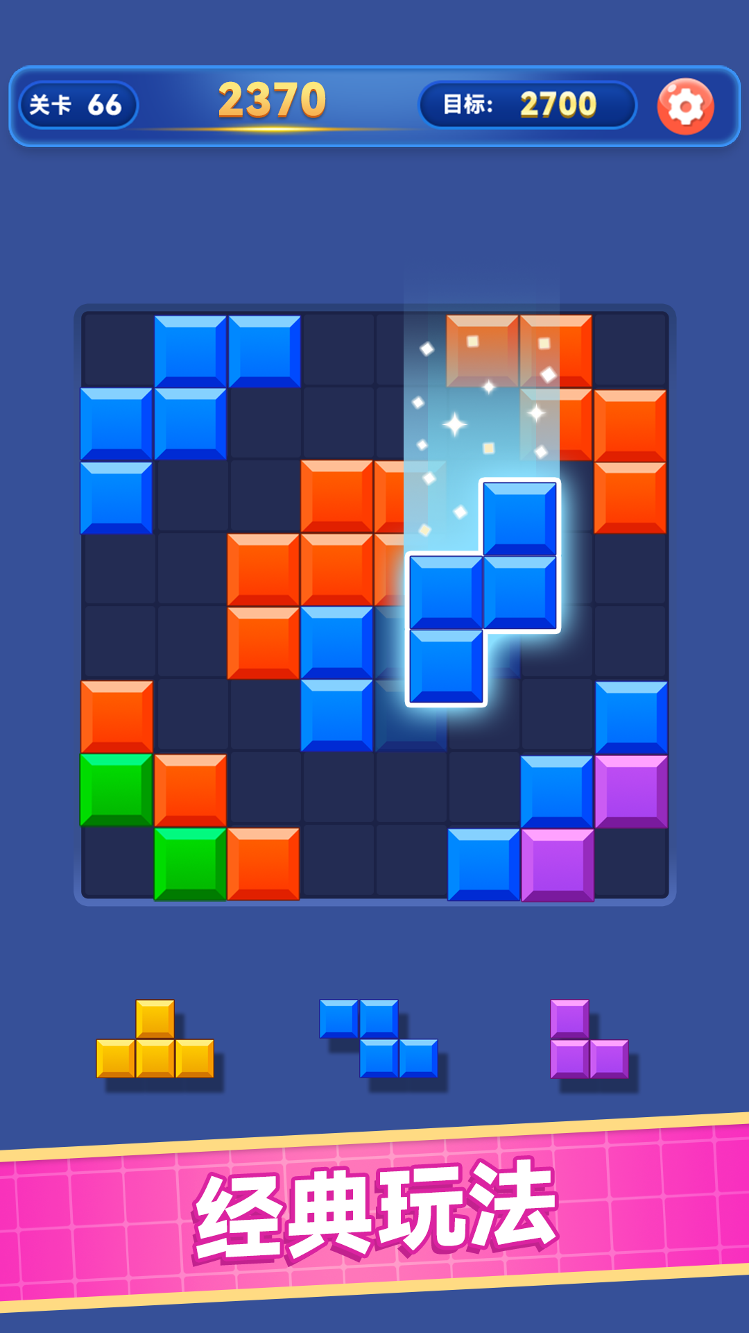1. 核心玩法:玩家需将随机生成的方块拖拽至棋盘空白区域,当横向或纵向格子被填满时自动消除并得分。游戏保留俄罗斯方块经典规则,但通过“拖动消除”替代传统下落机制,增加布局精准度要求,例如需预判后续方块形状以避免局部堆积。