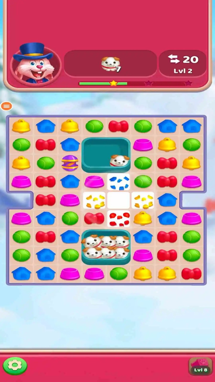 4. 动态关卡目标:每关任务从单纯消除升级为解锁装饰、清理障碍、收集狗狗等多样化目标,配合步数限制机制,考验玩家规划效率与连锁反应预判能力。