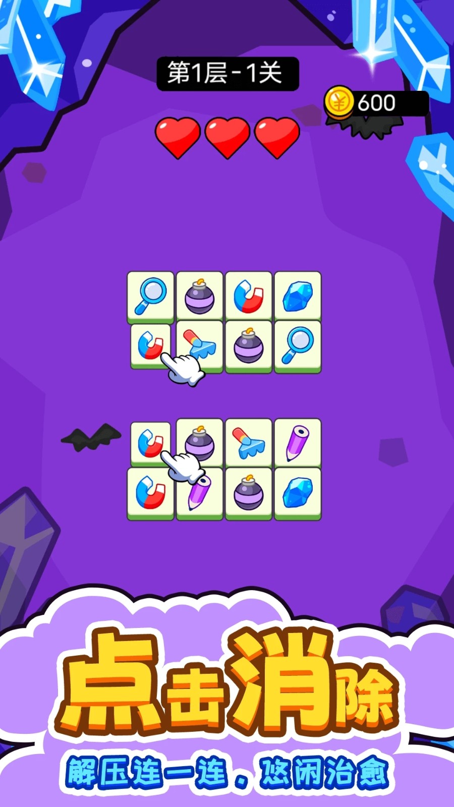 1. 基础操作:点击屏幕选择两个相同图标,连线转折不超过三次即可消除。系统实时预览路径走向,避免无效操作。例如在消除角落图标时,路径会自动规划最优路线。