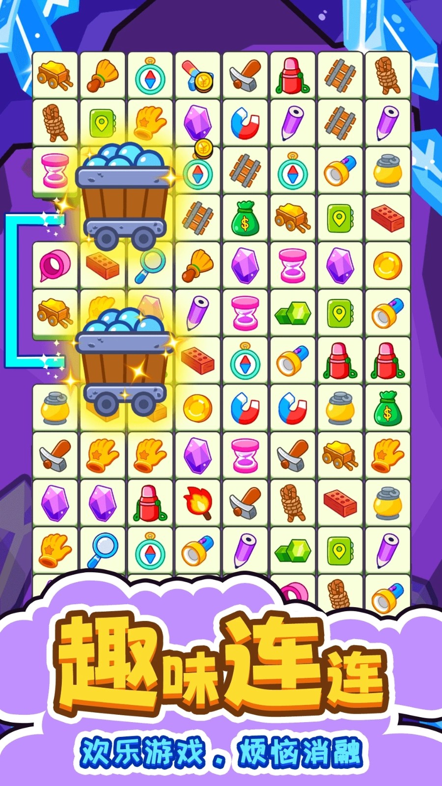 2. 动态难度机制:游戏采用递进式难度设计,从初始8×10网格的5种图标,逐步扩展至15×20网格的20种复杂组合。以2025年9月发布的关卡为例,第50关开始引入“锁定方块”障碍,要求玩家先消除特定图案才能解锁连接路径,考验策略规划能力。