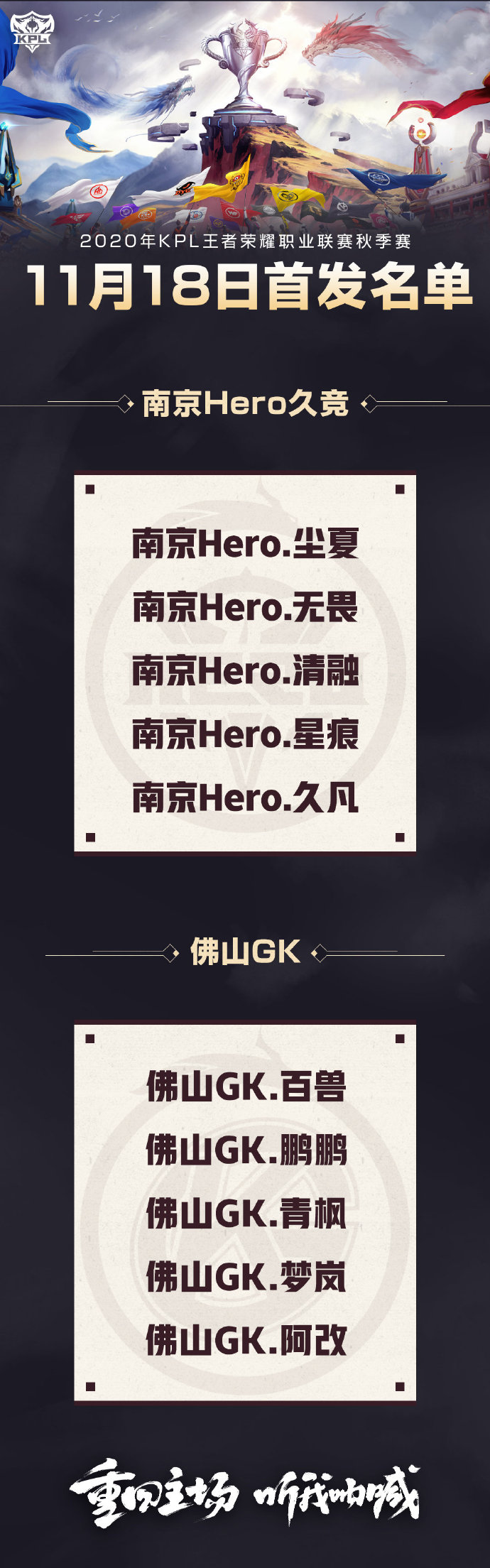 王者荣耀KPL11月18日赛程介绍。王者荣耀秋季赛常规赛最后一周比赛将在今天开始,今天将会有两场比赛,下面小编给大家介绍一下首发名单,一起来看看吧。