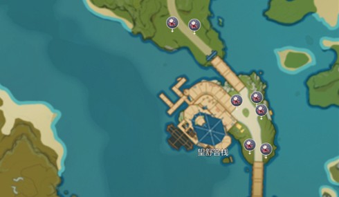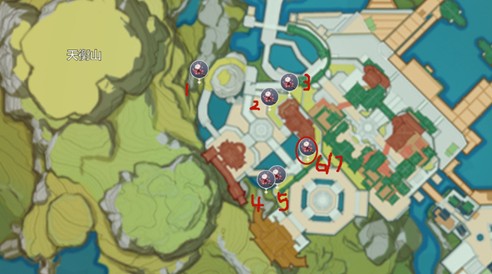 1、璃月港(7处刷新点,共计14朵,红色圈圈的地方有两株)。