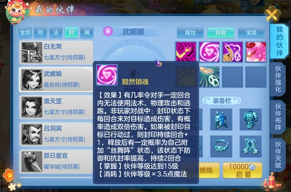 在伙伴方面龙宫的摩昂太子绝对是首选的法术伙伴,因为摩昂太子的门派心法触发几率很高,并且在对局中还能敌方单位造成AOE群体法系输出,另外善财龙女在对局中能为己方单位提供一定的回复能力,搭配红拂女让队伍中也有着一定的物理输出能力,在封系伙伴可以选择盘丝,盘丝对物理和法系门派都有着一定的克制作用,而且本身法师防御低,敌方物理伤害很高,盘丝相对而言很适合这个阵容的选择。