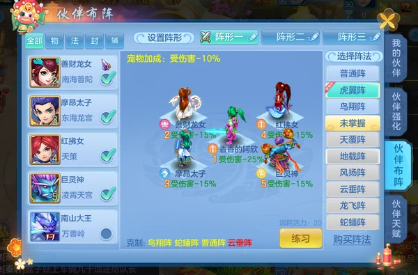 在阵法上推荐选择地载阵,因为地载阵能让己方整体单位有着不俗的减伤能力,可以把善财龙女放在减伤25%的位置,让其有更多的生存空间,好在对局中持续为队友回复气血。这样在对局中不仅能对敌方有着姣好的克制作用,而且队伍整体可攻可守,续航能力非常优秀。