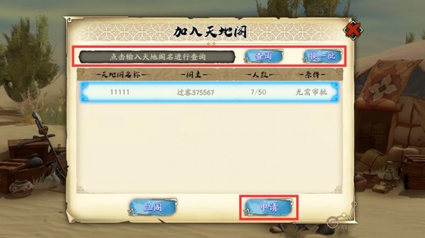 1、如果已经有了心仪的天地阁,可以在天地阁弹窗上方输入心仪的天地阁的部分或全部名称查询。