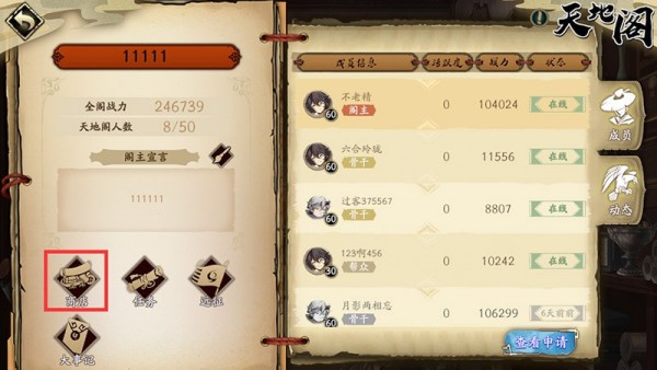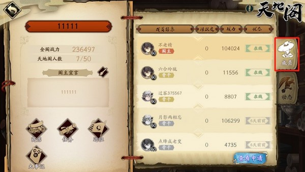 1、点击天地阁右侧的【成员】页签,可以查看到每一位成员信息,包括(名片、战力、在线状态)。