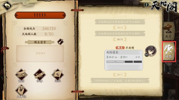 点击天地阁右侧的【动态】页签,可以看到各种天地阁玩法相关的动态信息。