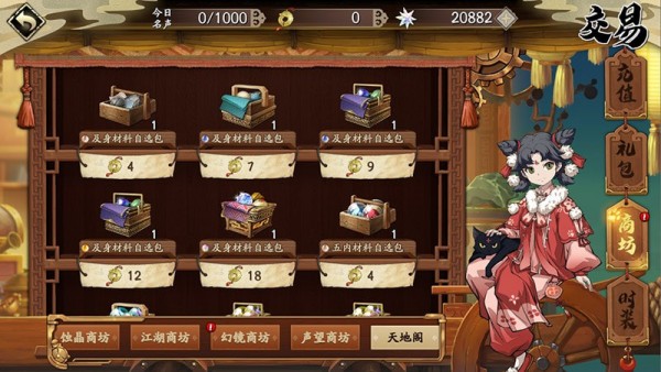 点击天地阁界面的左下角的【商店】按钮快速跳转至【天地阁商坊】,使用【名声】购买各类养成强化材料。