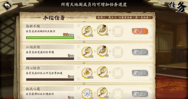2、天地阁任务需要全体成员共同完成,推动任务进度,完成任务可获得名声、蚀之晶和铜钱等奖励。