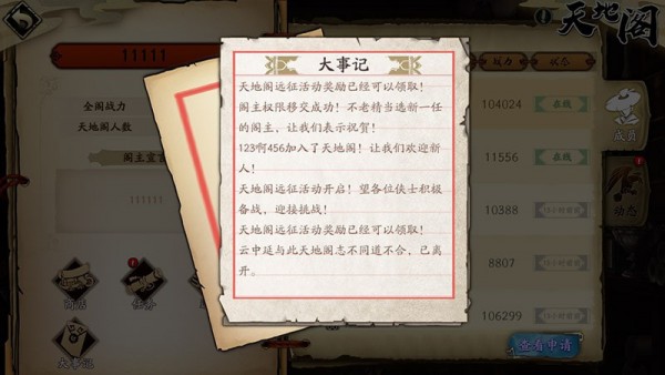 2、天地阁的成员变动、任命记录以及远征相关信息会在这里展示。