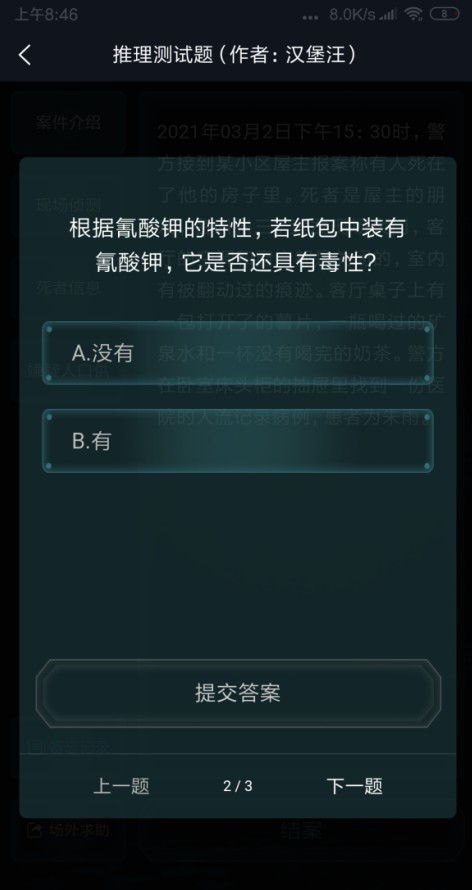 案发现场有3个疑似毒药容器的东西,一个被掰成两半的胶囊,一个小玻璃瓶和一个十分陈旧的纸包。另外,在3月2日下午大约13:00点到15:00点间,由于附近施工不当误切断了电线,造成整个小区停电。