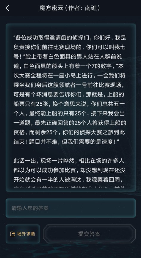 本次大赛全程将在一座小岛上进行,一会我们将乘坐我们身后这艘领航者一号前往比赛现场,可是有个坏消息要告诉你们,那就是,上船的船票只有25张,换个意思来说,你们总共五十个人,最终能上船的只有25个,接下来我会出一道题,最先正确回答的25个人将获得上船的资格,而剩余25个,你们的侦探大赛之旅到此结束!题目并不难,但我们需要的是速度!”