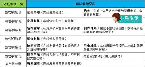 在自宅等级提升,并完成对应任务后,玩家才能解锁包括料理、钓鱼、制作家具、裁剪服装、领养猫咪、饲养羊驼、进行甲虫对战、装扮家园,海岛探索等各种玩法。当然,不少玩法还有更加细节的部分,比如可以捕捉的动物分为普通动物和稀有动物,稀有动物的刷新时间和出现条件又跟天气和时间有关,只有满足特定条件才能进行捕捉饲养,例如彩虹羊驼只在夜晚时分才会在木灵峡谷出现,灰羊仅在晴天才会在月影密林刷新。