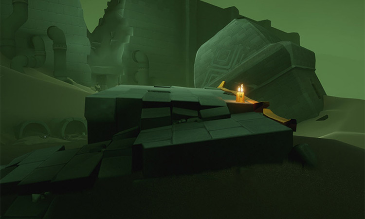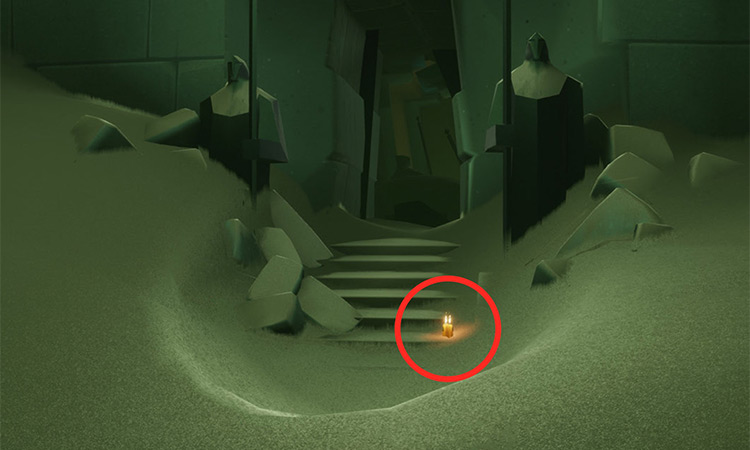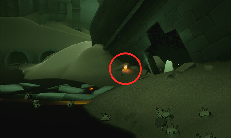 季节蜡烛在破庙门口,位于左边的小石墩上。