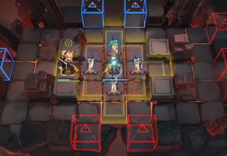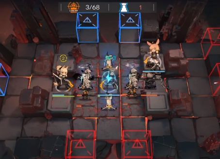 开局如下图所示位置下德克萨斯,然后剑雨好了就放,产生的COST放四个朝向德克萨斯的充能器,利用剑雨的晕眩和地火的伤害打死第一个大锤哥。