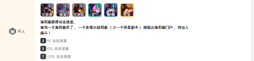 分析:小恶魔羁绊有两个效果,一是基础的额外攻击速度加成。其中3小恶魔羁绊距离2小恶魔羁绊的跨度非常大,3小恶魔的攻击速度只有区区5%,所以游戏过程中建议玩家多上两个小恶魔,这样攻速的提升直接翻倍。