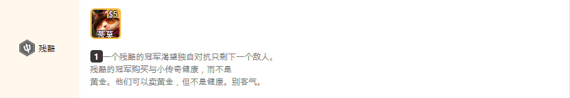 此羁绊也是云顶非常有特色的羁绊,羁绊效果上没有任何属性加成,但是为提莫营造了只能用生命值购买的机制。提莫S5需要花费6点生命值来购买,卖掉提莫仅能换回5金币。