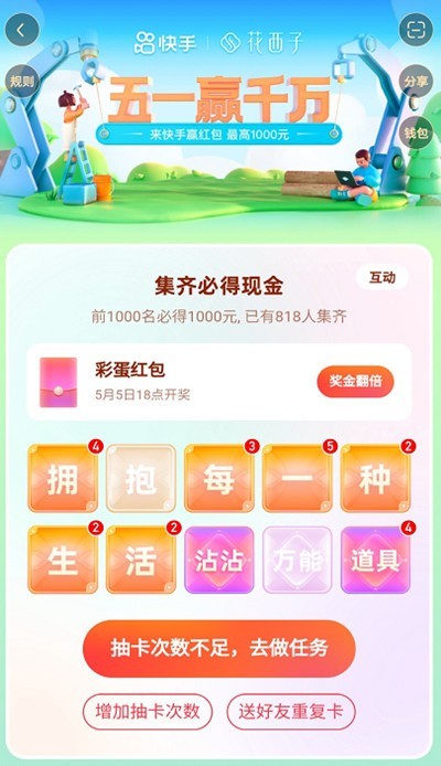 近期在快手当中开启了特殊的集卡活动,活动期间,集齐「拥」、「抱」、「每」、「一」、「种」、「生」、「活」7张卡片,可以合成集齐红包,可以在开奖期间随机瓜分千万现金红包。